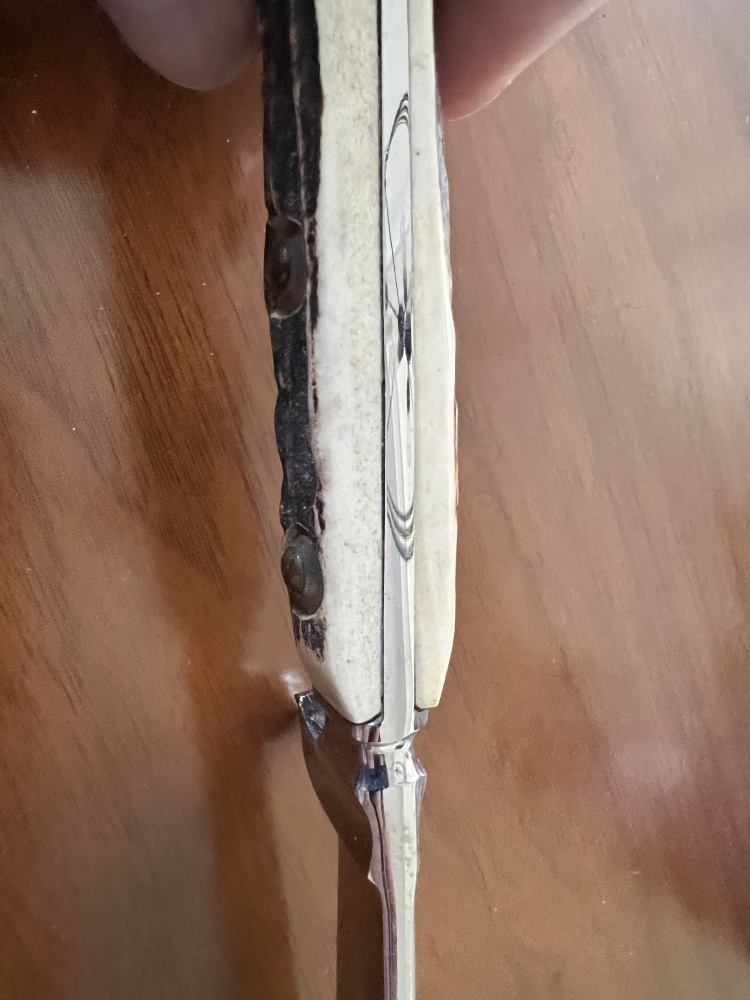 This knife is over 30 years old and in immaculate condition. German made. Genuine Stag handle scales with green leather sheath.