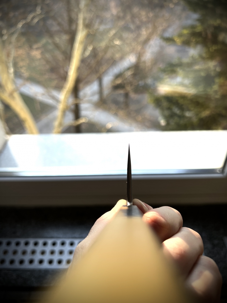 For sale a masterpiece from Simon Krichbaum. Apex ultra steel with wrought iron cladding. Size is 280x61mm and weighs 300g. It has detachable handle, a tool made from Padauk for removing the handle is included. Handle is made from two tone African Blackwood. Lightly used, never sharpened.