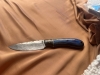 Made by BNB knife company. 512 layers of stainless and high carbon steel. This 4” blade fixed blade knife is exquisite and beautifully made! Total length of the knife is 8”. Initialed and logo are on the blade. The wood is blue maple with gold hardware. Never used, display only. 1/4 “ spine with notches. Handle length is 4”. Fits perfectly in your hand. Not real heavy, but feels comfortable. Oiled and kept on display about a year. Wood is blue maple.